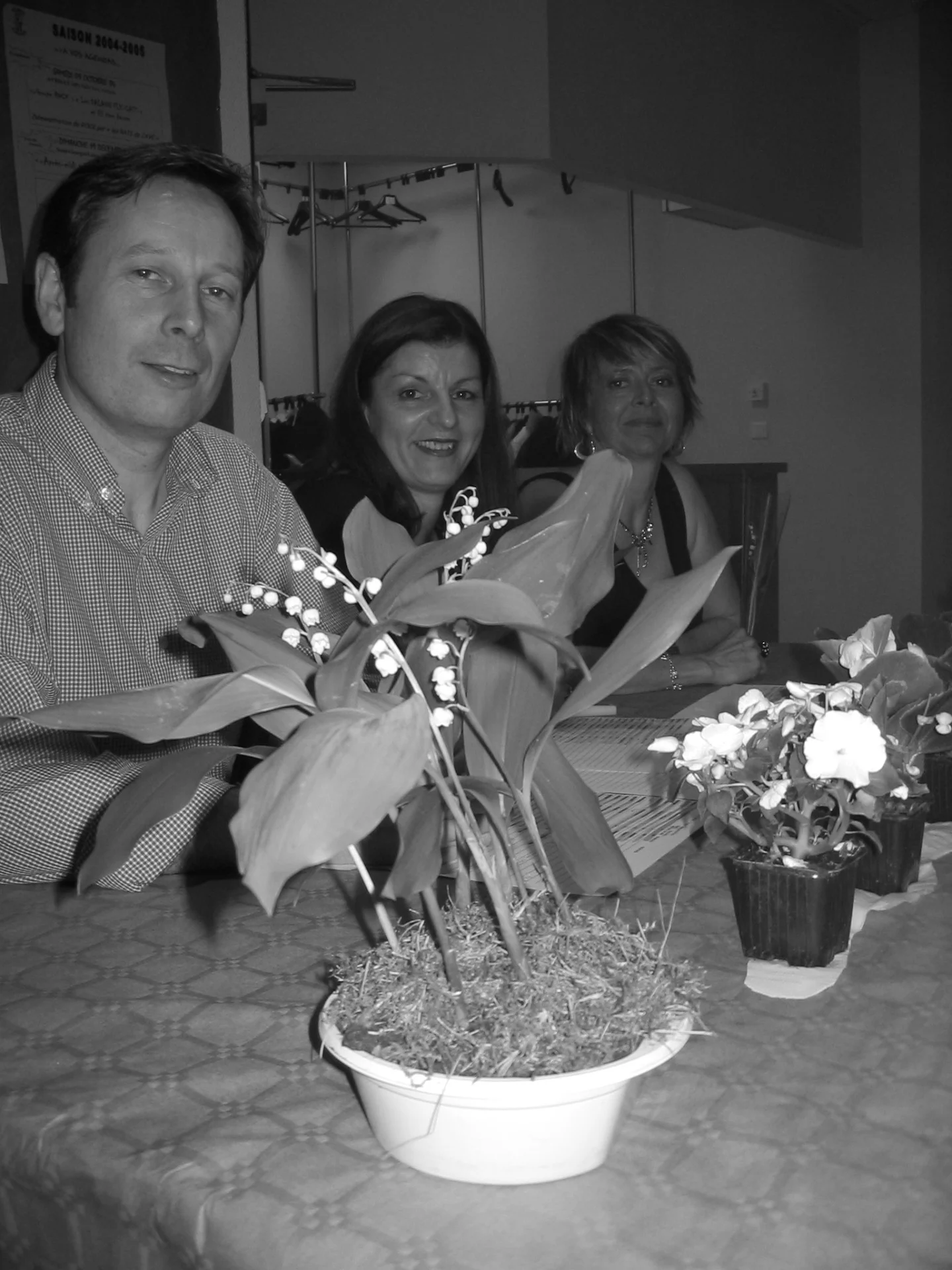 Fred, Christelle, Françoise à l'accueil devant la déco muguet
